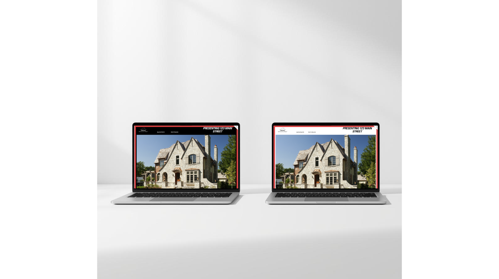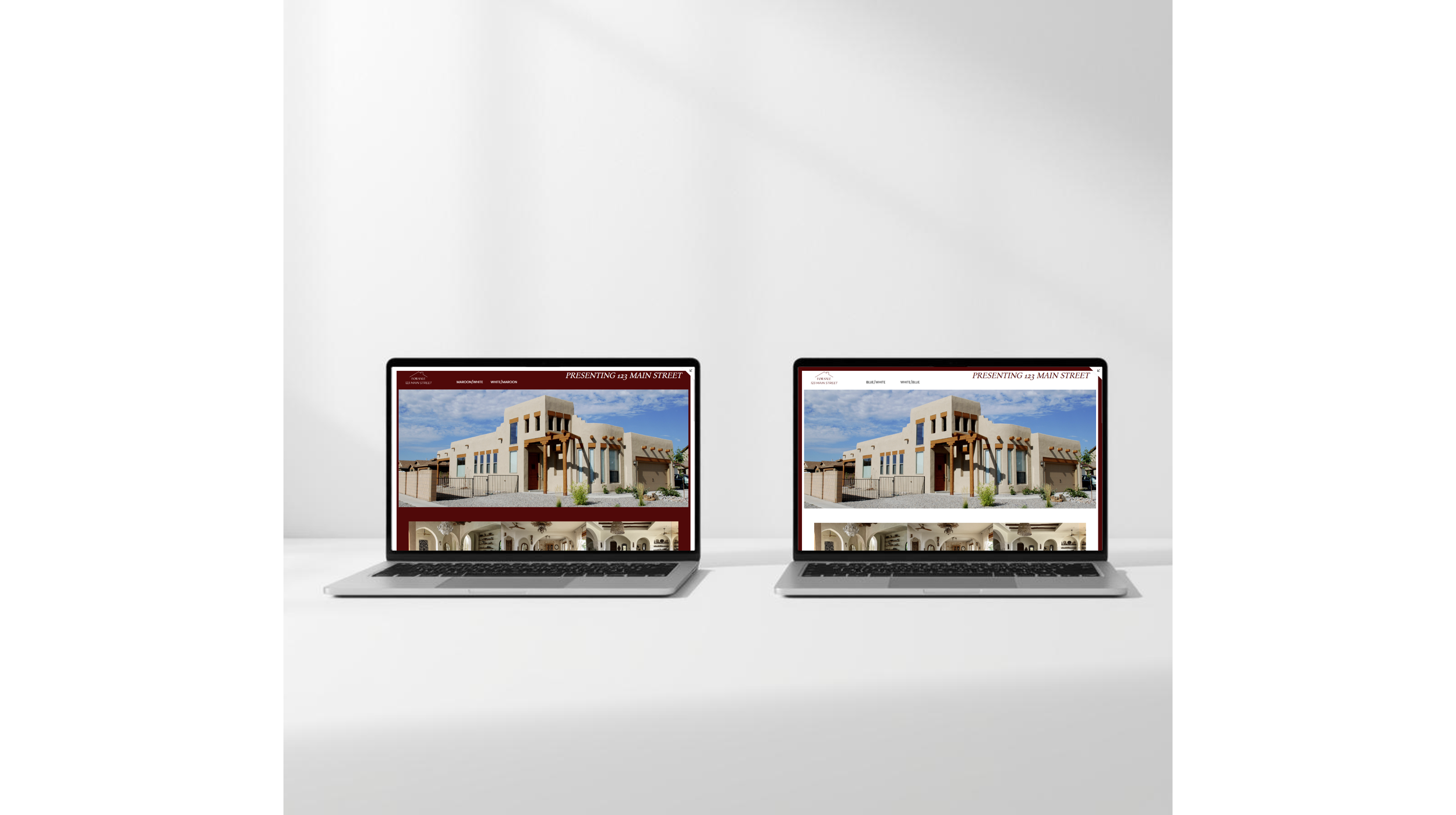 2 traditional maroon-and-white themes with formal serif text and balanced, traditional layout elements. Designed to showcase homes with classic details, mature landscaping, and a sense of history.